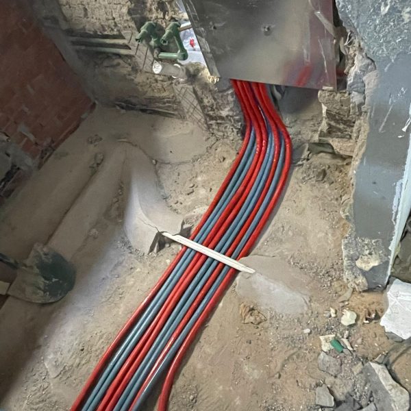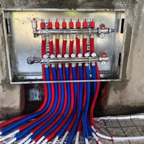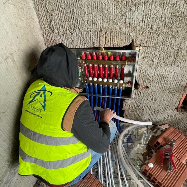 تتكون من شرائح الالومينيوم فى كل غرفة (بيتم حساب عدد الشرائح على حسب مساحة كل غرفة) ثم يتم توصيل هذه الشرائح الى لوحة التوزيع و التحكم (Manifold) عن طريق مواسير معزولة تحت الارض و يتم تجميع جميع المواسير الموجودة في لوحة التحكم (Manifold) وتوصيلها الى السخان المركزي ( بيغذي مياه ساخنة للحمامات والمطبخ و للشرائح الالمونيوم للتدفئة) عن طريق تسخينها وبالتالى تدفئة الغرفة عن طريق الحرارة الاتية من شرائح الالومينيوم.